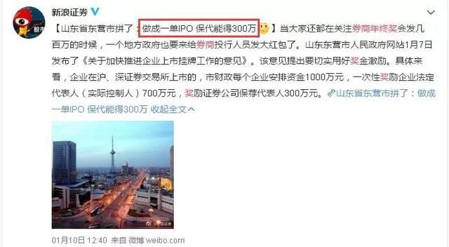 1月10日,山东省东营市发话了:做成一单IPO,保代能得300万!