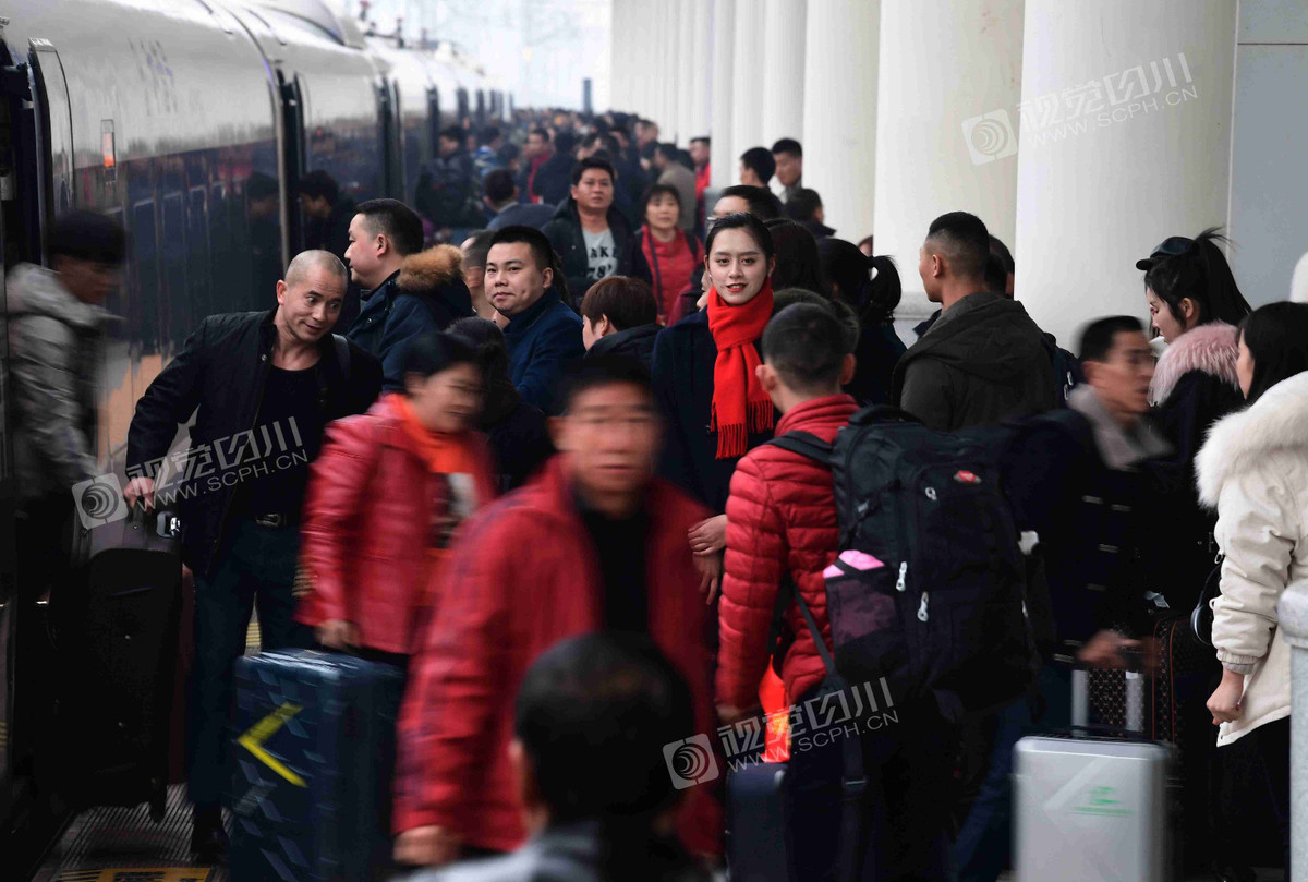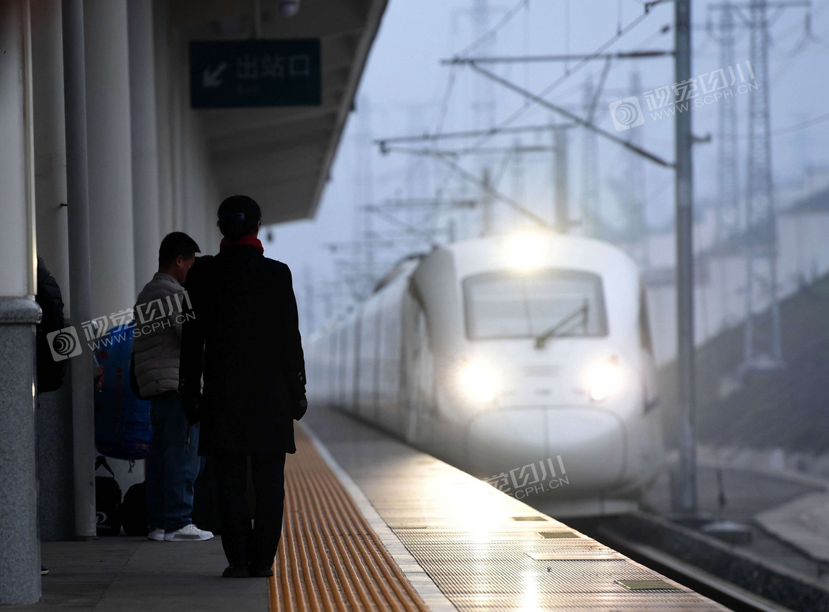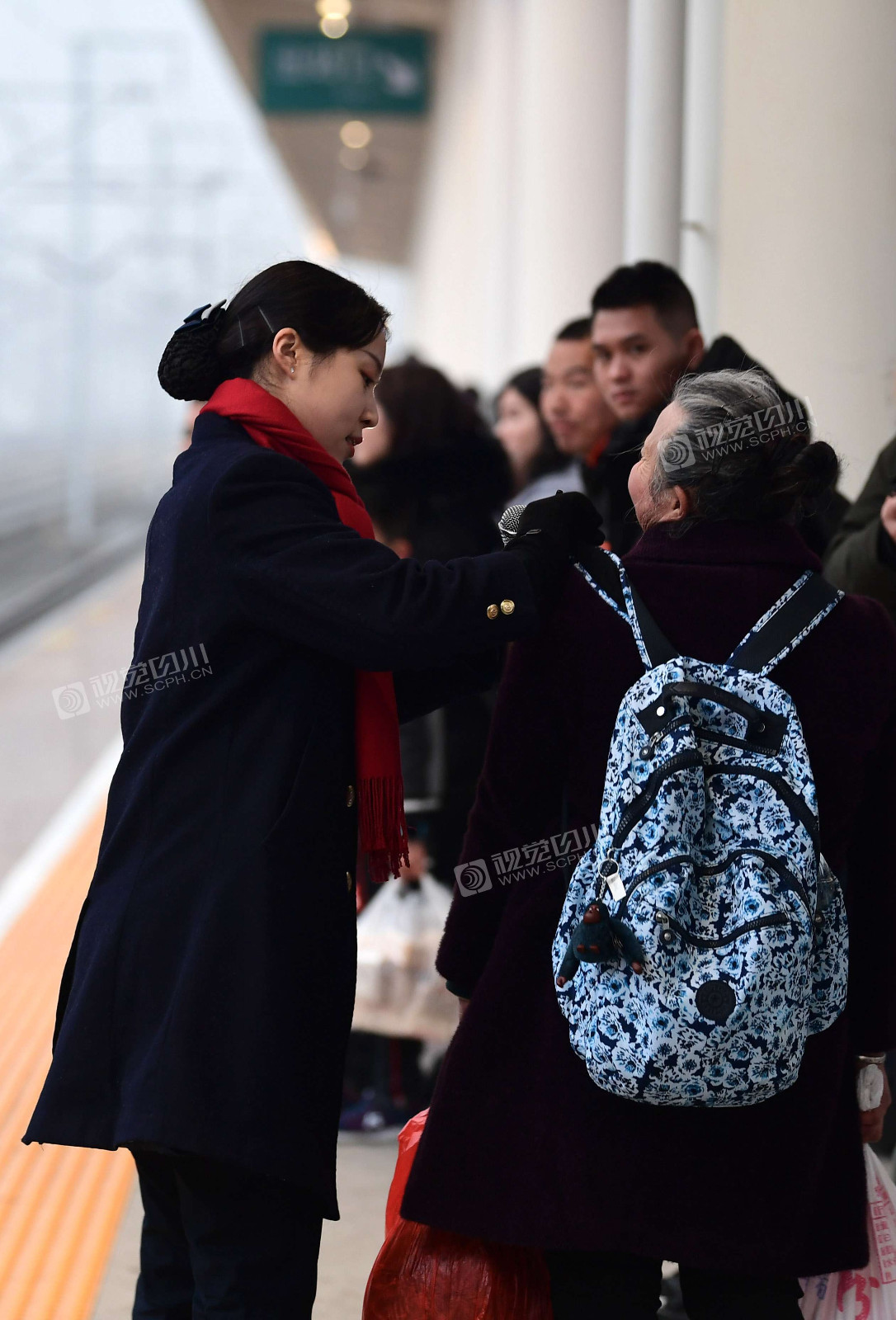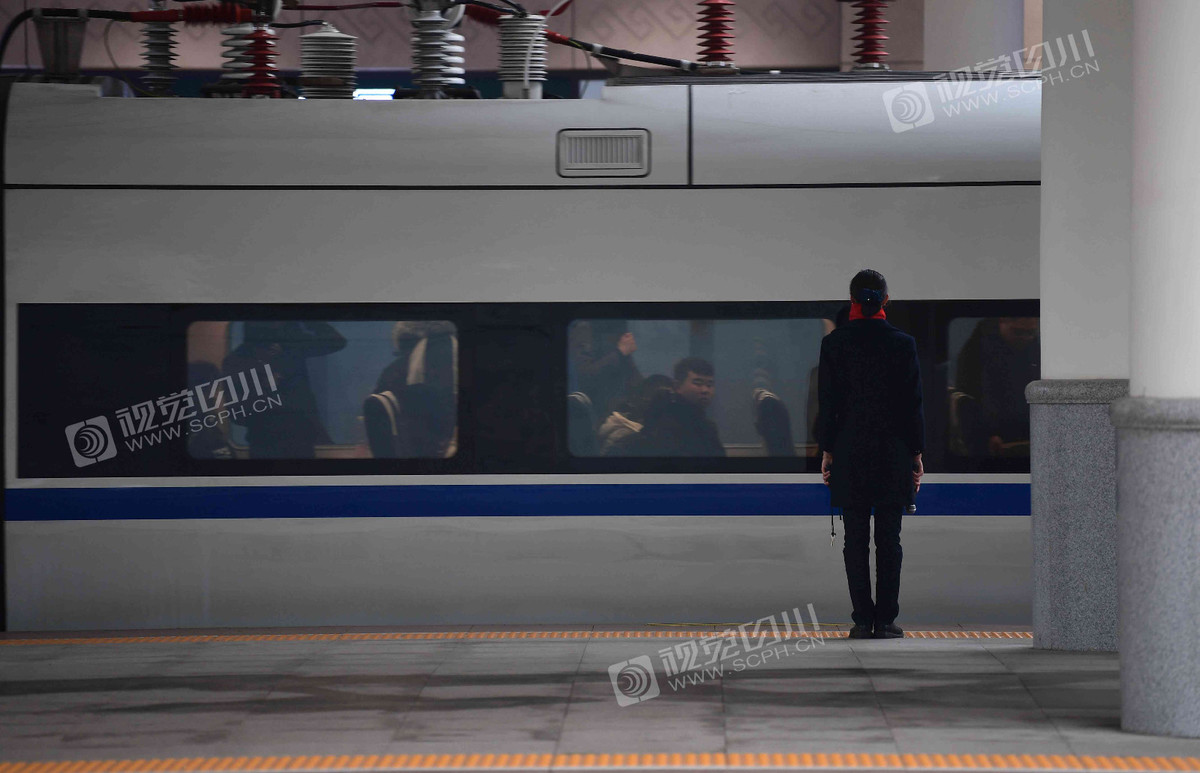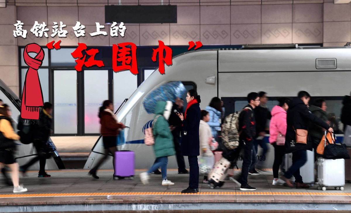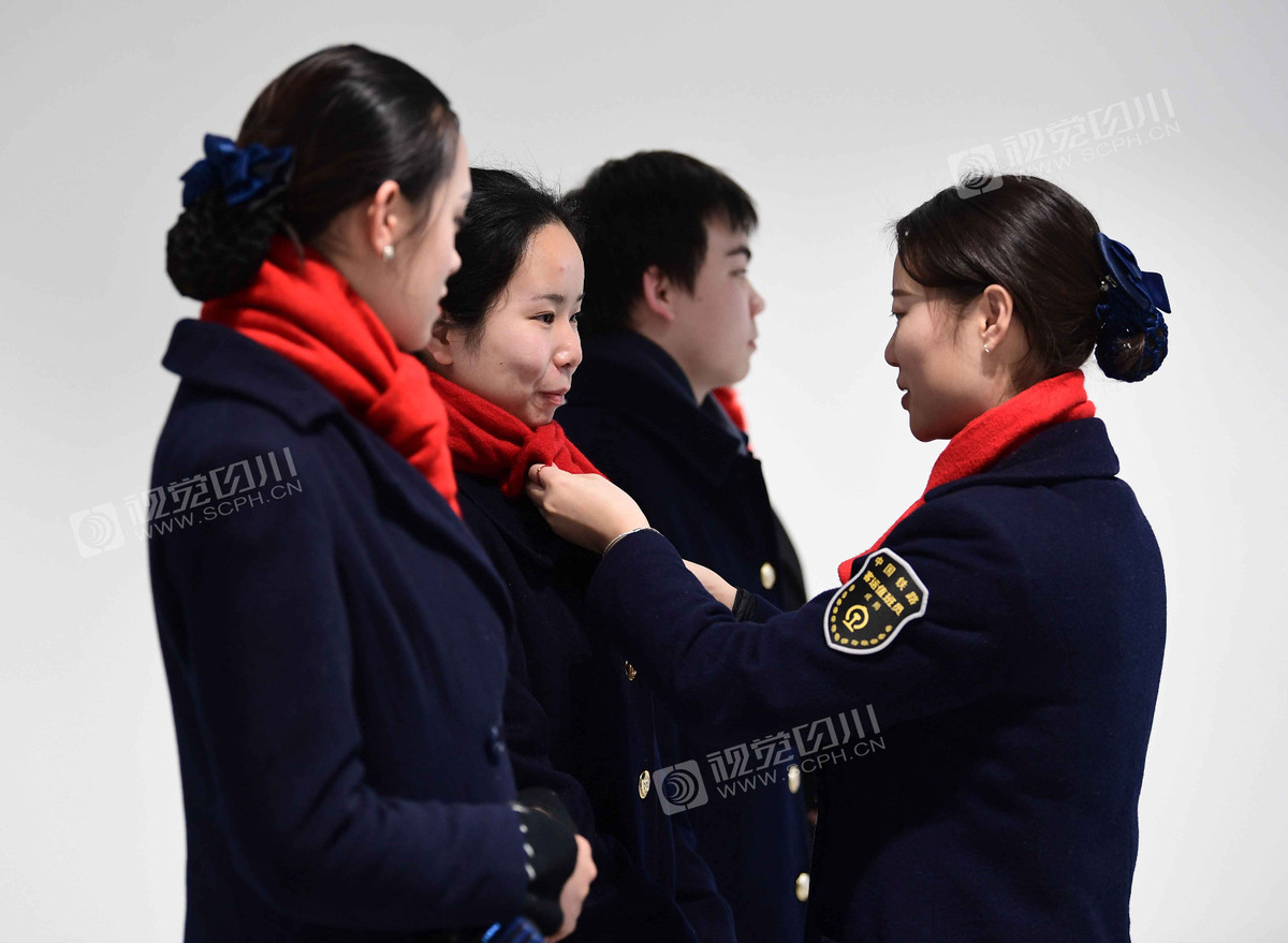 1月14日晚上6点,在宜宾市宜宾西站站台上,客运员孔芸拿着话筒喊话,“旅客朋友们,请站在黄线后,注意安全,”这个时候她已经在站台上工作了8个多小时,身后的高铁客车即将进站。在宜宾西站的站台上有10名客运员,最显著特征是脖子上的“红围巾”,在拥挤的人群中格外醒目。她们每天从早上7点半就开始在站台上为进出站的旅客服务,组织旅客出站,保证站台安全。春运刚刚开始,客运的人流就明显加大,每天有3.5万人在站台上进出,她们就在站台上往返为旅客服务,保证了出行安全。