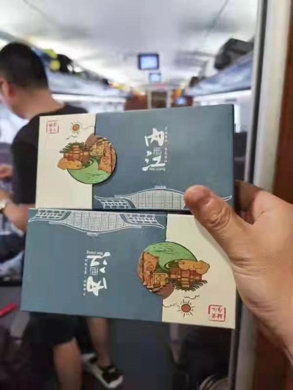 “我是重庆人,这次坐高铁出去玩没想到能吃到这么地道、巴适的内江小吃。”打开礼盒,张先生拿起一块黄老五坚果乳酥品尝起来。