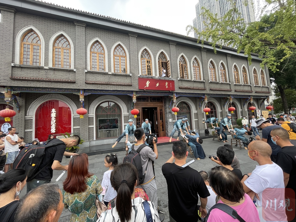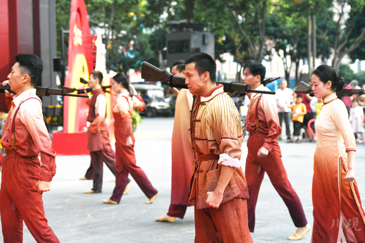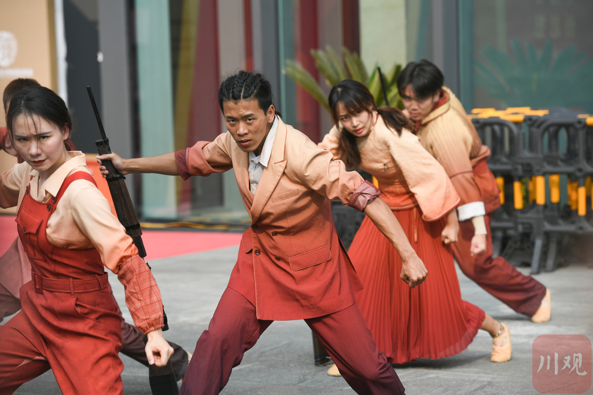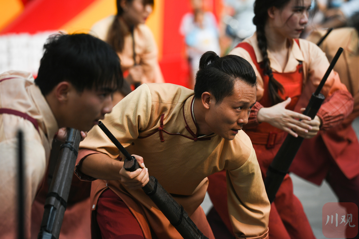 随后,剧组演员转战成都中心地标天府广场,再来到四川大剧院,演绎《努力餐》血战到底的片段。“就算毁灭端碗的手,永远不会垂起,就算战死我把脑壳昂起,努力努力血战到底,努力努力血战到底……”剧中结尾的川话RAP片段点燃街头气氛,血战到底的演员们配上长枪挥舞,红色故事精彩瞬间为路人们生动地诠释了革命前辈们为老百姓奋斗的场景。