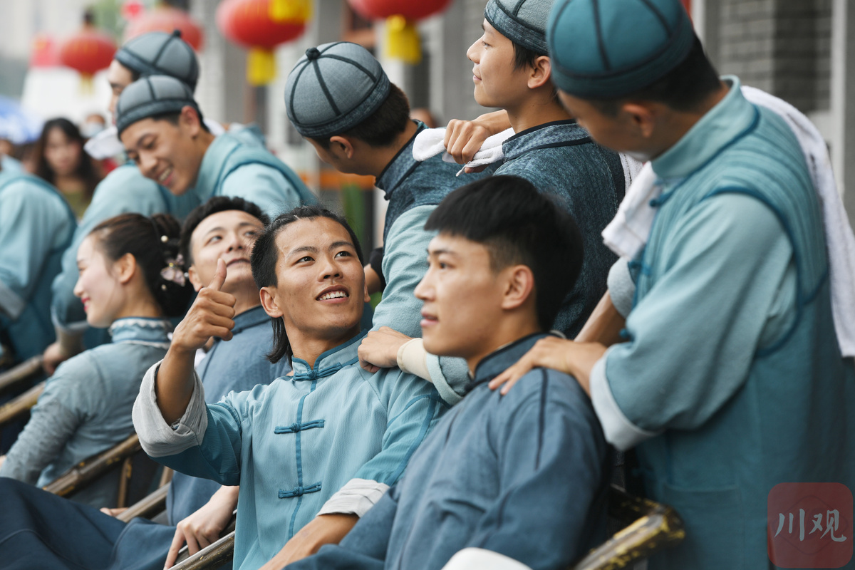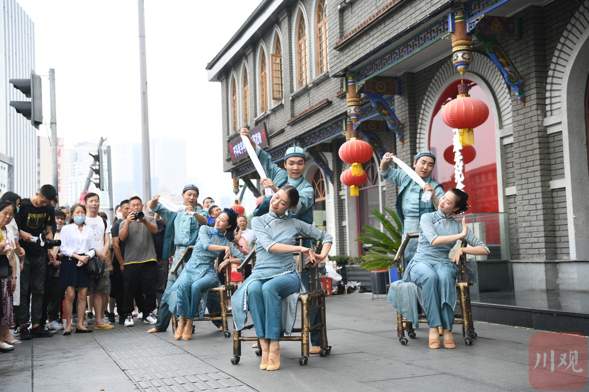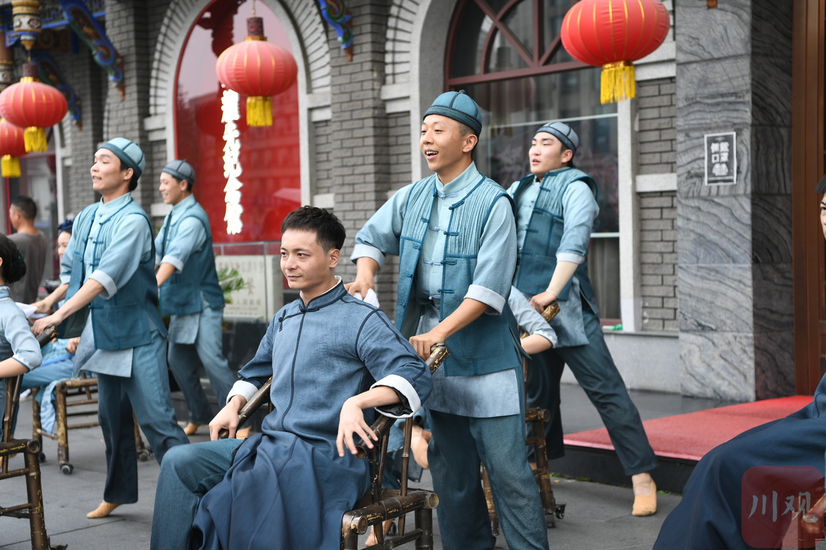 下午两点,在成都宽窄巷子努力餐楼门口,伴随着《太阳出来喜洋洋》的四川民间音乐,演员们身着深蓝色长衫,推着四川特色竹椅,笑着招徕客人,宾客满楼纷至沓来,有的喜滋滋地品着川茶、懒洋洋地掏耳朵、有的舒舒服服地洗脚……再现了舞剧《努力餐》中开门迎客的场景,舞剧《努力餐》也回到了剧中的故事原型地标上。