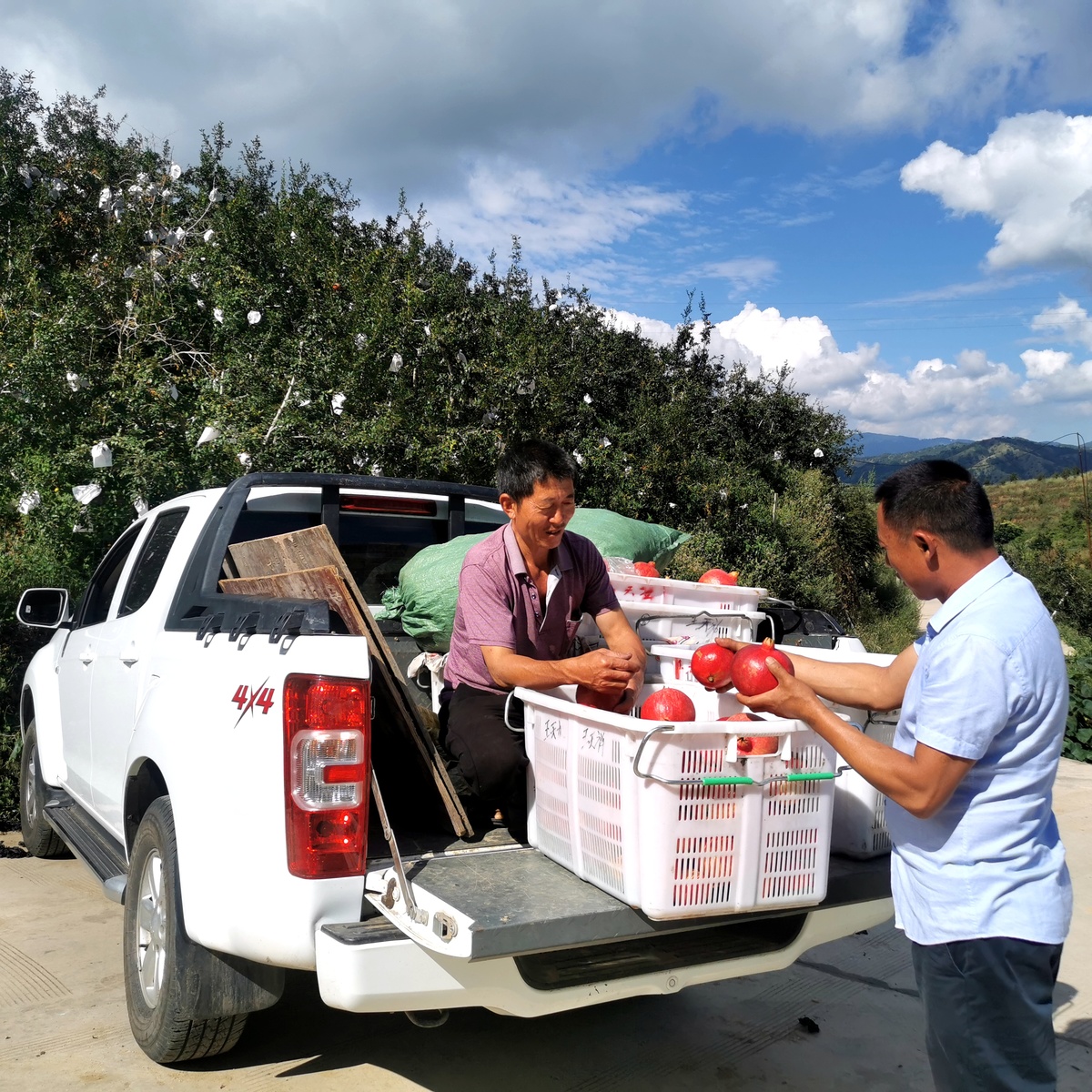 10月3日,攀枝花市仁和区大田镇榴园村前哨组,村民王天祥一大早在自家果园忙开了,尽管正值国庆黄金周,还有果子待采,王天祥并不空闲,全家齐上阵,将一筐筐火红石榴抬上农用三轮车。