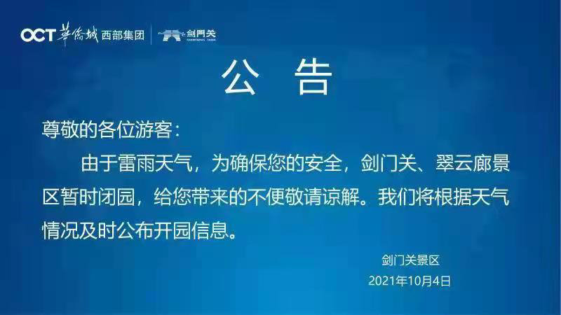10月4日上午,川观新闻记者从剑门关华侨城获悉:因雷雨及大风天气,为确保安全,剑门关景区、翠云廊今日上午暂时闭园。开园时间将根据天气情况而定。