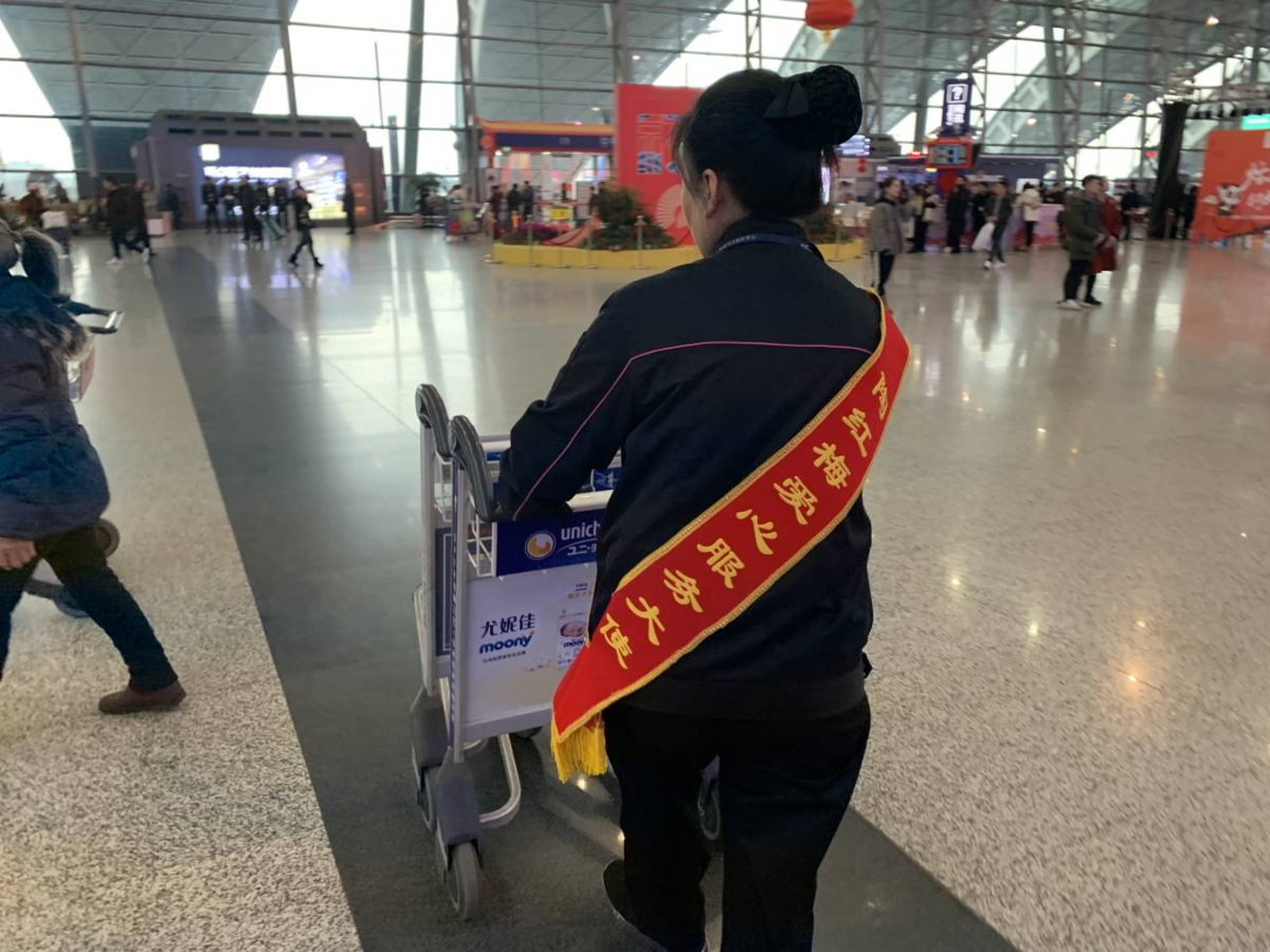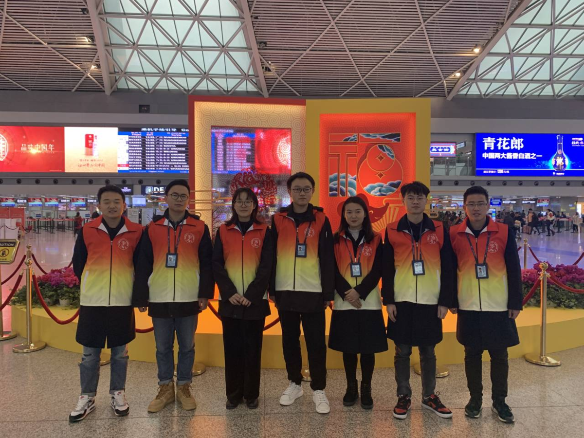 他们是四川省机场集团有限公司专门针对春运派出的志愿者,在春运期间为旅客提供志愿服务,保证出行便利。记者注意到,短短半小时,志愿者们便接待了近百位旅客,为他们解答问题、运送行李等。