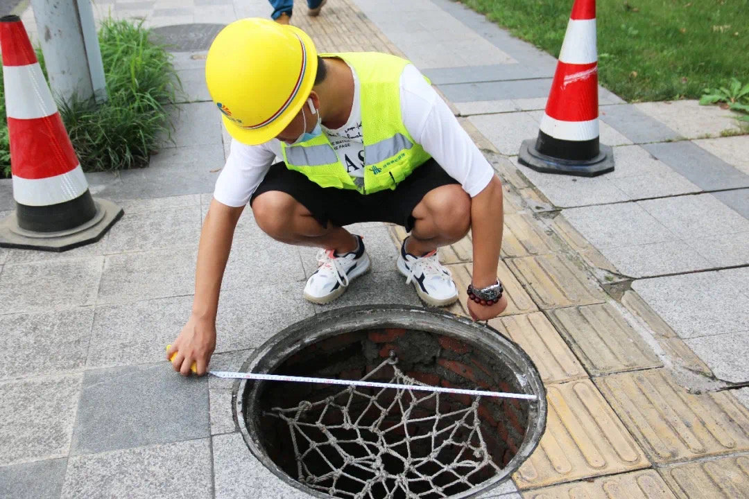 快速设置好警示牌、锥形筒,检查了井盖破损情况后,处置人员合力将破损井盖取下放置到一侧,仔细查看井盖内的防坠网是否完好,并使用卷尺测量井口尺寸,确定应急井盖规格。从接到抢险通知到完成应急处置,时间不到半小时。