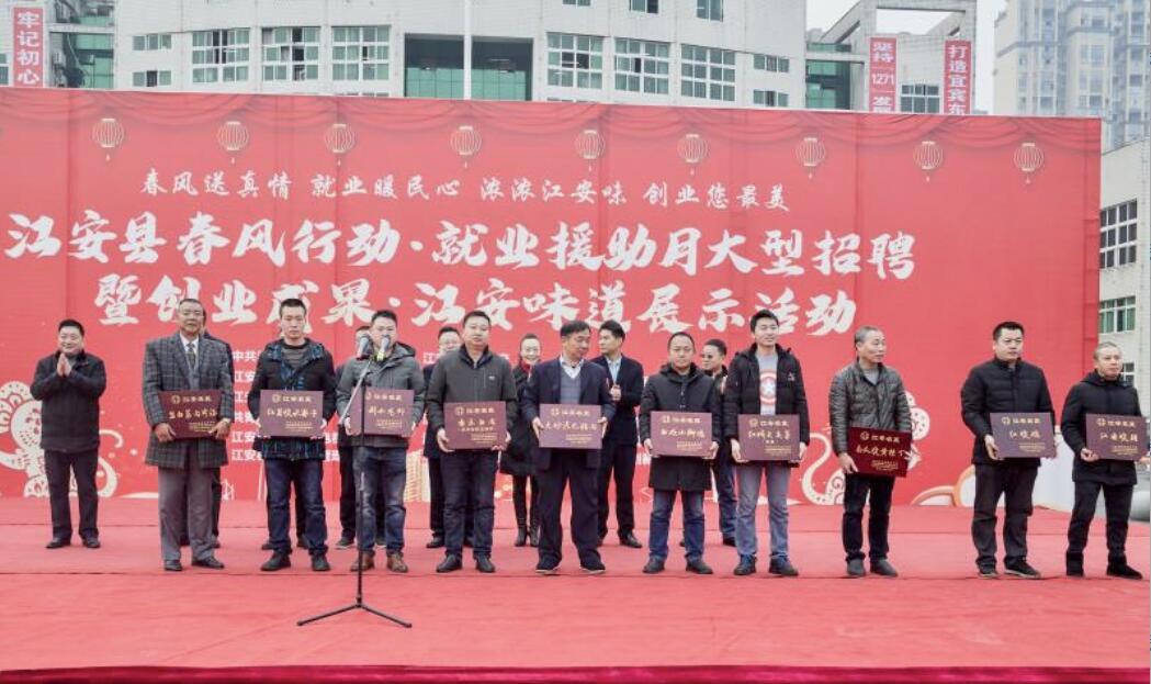 新春来临前夕,为了给返乡过年的务工人员搭建好求职双向选择平台,并向他们宣传和推介本地众多自主创业成功的美食品牌产品,1月19日,宜宾市江安县举行“春风行动·就业援助月”大型招聘暨创业成果·江安味道展示活动。活动由江安县委、县政府主办。
