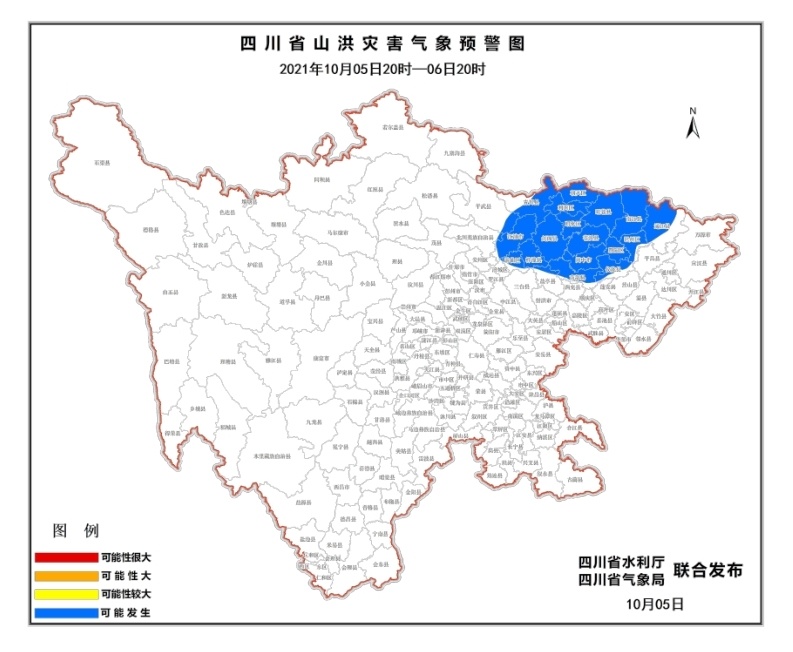 10月5日17时,四川省水利厅、四川省气象局联合发布山洪灾害蓝色预警。10月5日20时至6日20时,涪城、游仙、江油、盐亭、梓潼、平武、北川、朝天、利州、昭化、青川、剑阁、旺苍、苍溪、恩阳、巴州、南江、通江、阆中、南部、仪陇等县(市、区)可能发生山洪灾害。