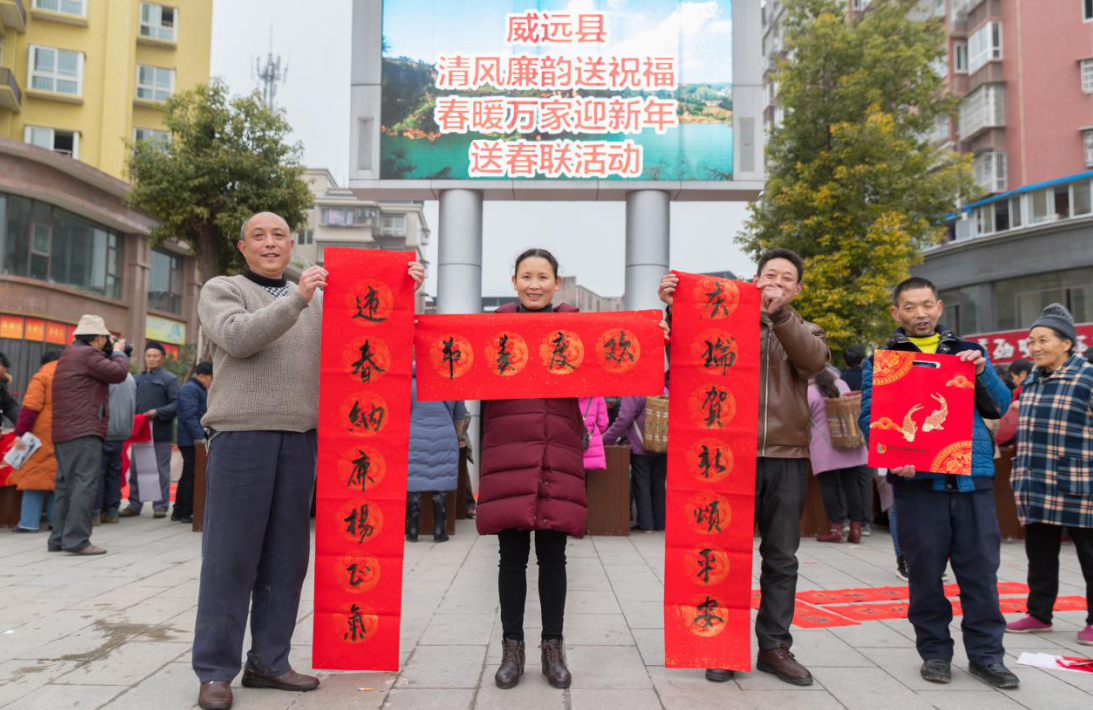 “这春联寓意真好,我儿子2019年刚考上公务员,我要赶紧把春联领回去贴上,希望他做个正直善良的人,做个廉政亲民的好干部。”威远县新场镇社区居民蒋英满脸笑意地诉说着新年愿望。