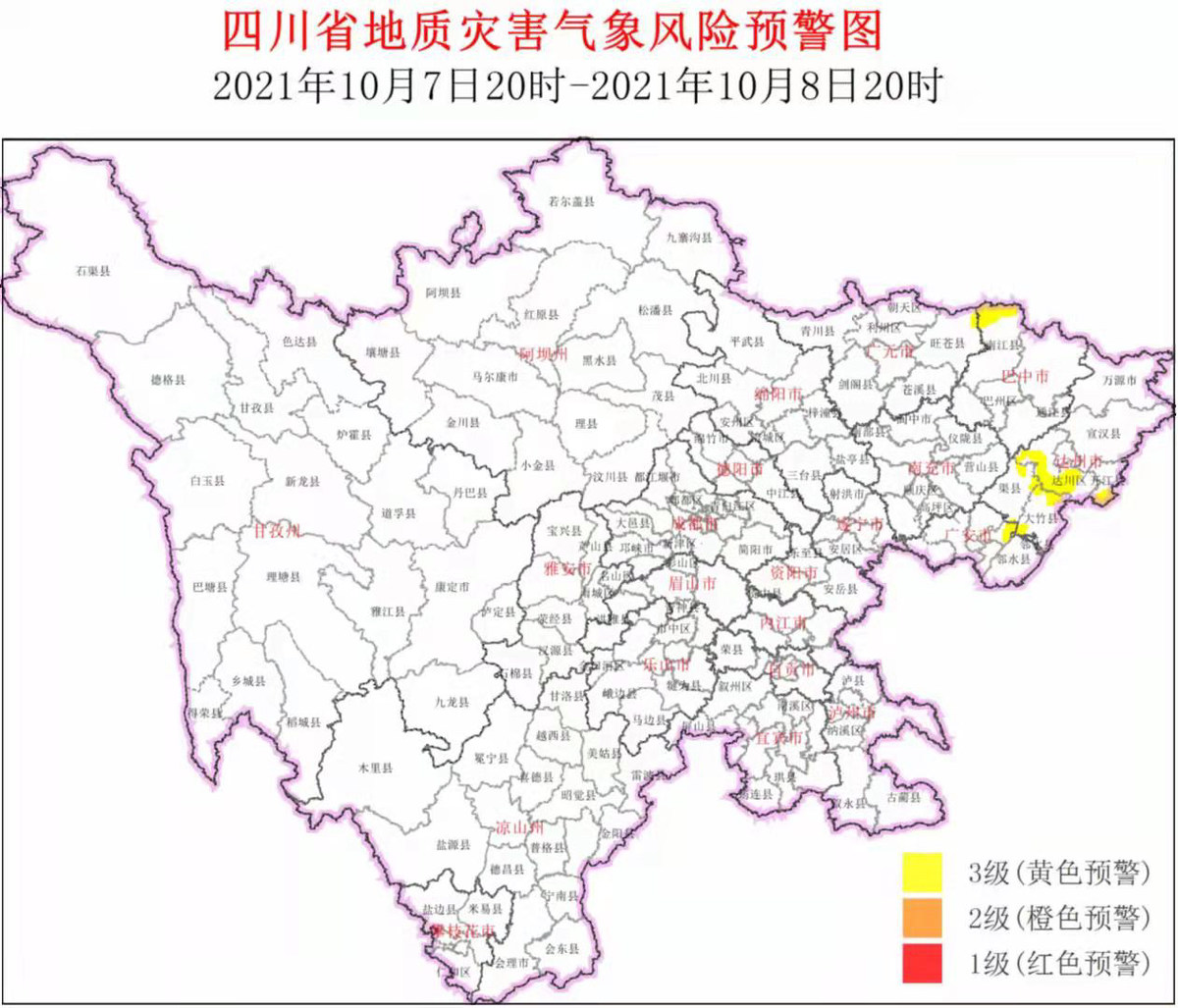 10月7日,四川省地质灾害指挥部办公室根据地质环境条件,结合四川省气象台天气预报情况,发布地灾气象风险黄色预警:10月7日20时至10月8日20时,广元旺苍县,巴中南江县,达州达川区、开江县、渠县、大竹县,广安前锋区等4市7个县(区)进入预警范围。
