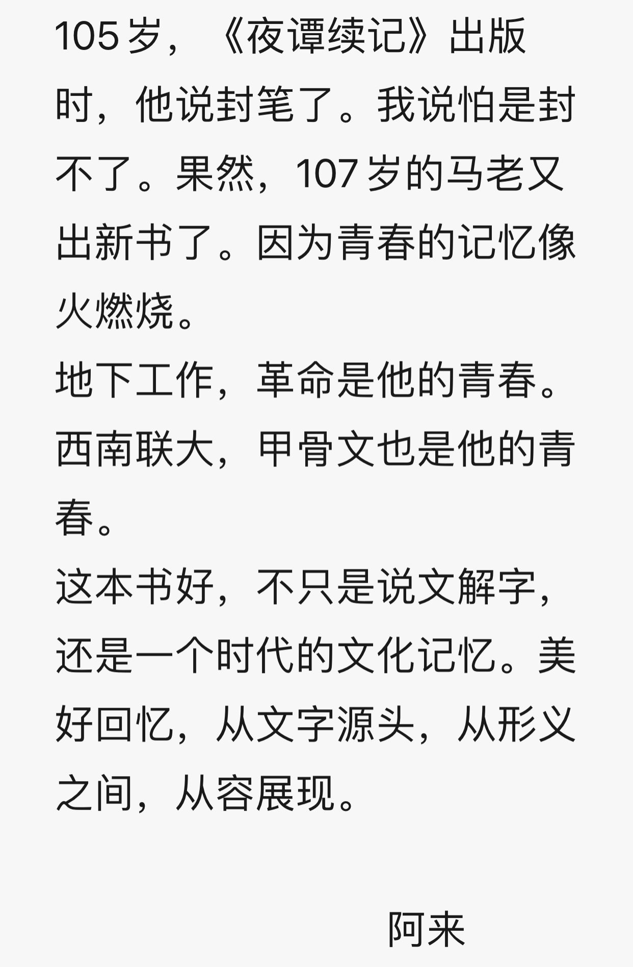 听闻《马识途西南联大甲骨文笔记》马上出版了,阿来很激动,他写道:“105岁,《夜谭续记》出版时,他说封笔了。我说怕是封不了。果然,107岁的马老又出新书了。因为青春的记忆像火燃烧。地下工作,革命是他的青春。西南联大,甲骨文也是他的青春。这本书好,不只是说文解字,还是一个时代的文化记忆。美好回忆,从文字源头,从形义之间,从容展现。”