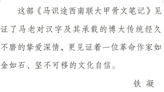 铁凝写道:“这部《马识途西南联大甲骨文笔记》见证了马老对汉字及其承载的博大传统经久不磨的挚爱深情,更见证着一位革命作家如金如石、坚不可移的文化自信。”