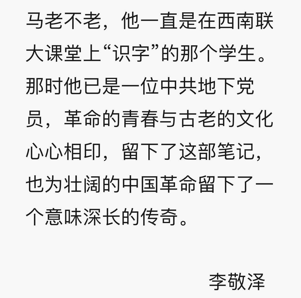 李敬泽写道:“马老不老,他一直是在西南联大课堂上'识字'的那个学生。那时他已是一位中共地下党员,革命的青春与古老的文化心心相印,留下了这部笔记,也为壮阔的中国革命留下了一个意味深长的传奇。”
