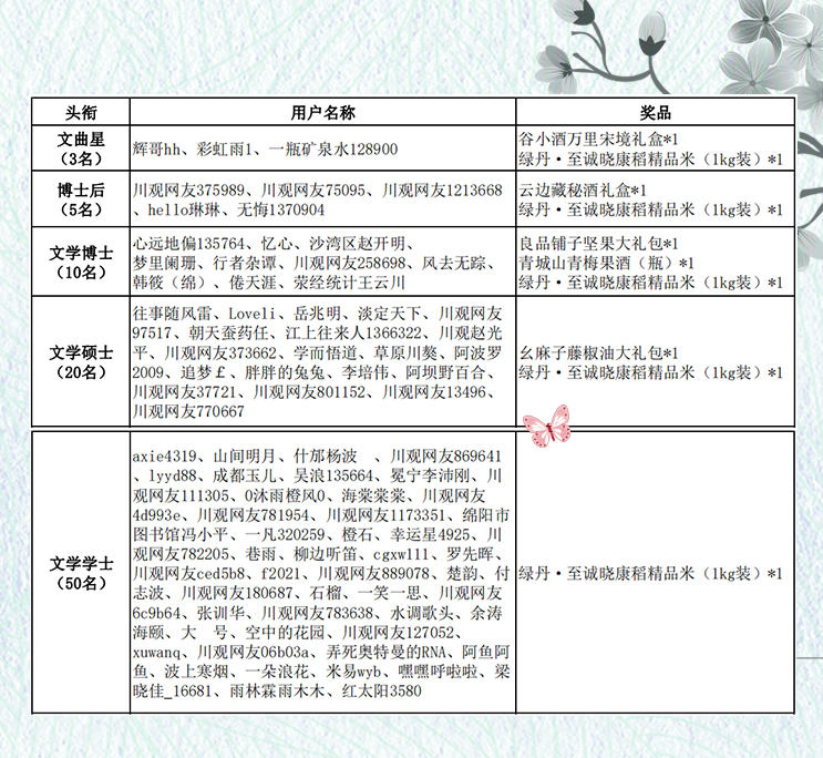 根据比赛规则,本次活动设置了超级豪华的心意大礼包,总积分排行榜前88位的粉丝,将获得定制好礼以及专属称号!分别是:文曲星(3名)、博士后(5名)、文学博士(10名)、文学硕士(20名)、文学学士(50名)。随着活动的正式结束,前88位粉丝名单已产生。