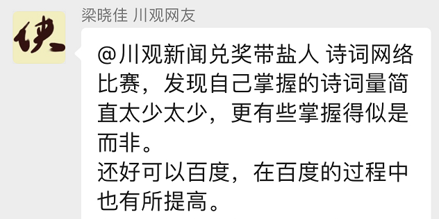 此外,川观新闻粉丝梁晓佳、李培伟进入了活动总排行的前88名,均表示很喜欢这次活动的形式。梁晓佳排名86“险胜”,他感言,“自己掌握的诗词量简直太少太少”,在参与活动的过程中,诗词素养有所提高。李培伟排位33名,他表示,“非常感谢川观新闻提供了参加诗词挑战的平台,通过这次比赛,发现自己平时掌握的诗词量还远远不够,还需努力学习。希望多多开展此类活动!”