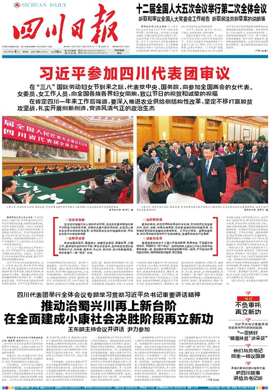 本版下部报道了四川代表团当天下午的全体会议,会议是专题学习贯彻习近平总书记重要讲话精神,报道的主标题是《推动治蜀兴川再上新台阶 在全面建成小康社会决胜阶段再立新功》。王东明主持会议并讲话,尹力参加。
