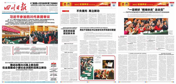 3月9日的四川日报,以7个整版的篇幅,图文并茂地报道了习总书记对四川的嘱托,以及在会场内外、在蜀中大地、在四川各界各族干部群众中间引发的热烈反响。