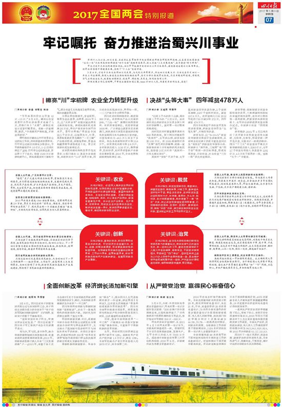 本版下部的两篇报道,来自四川日报记者对代表、委员及蜀中多地干部群众的采访。大家纷纷表示,要用实干回报总书记的亲切关怀和殷切期望。