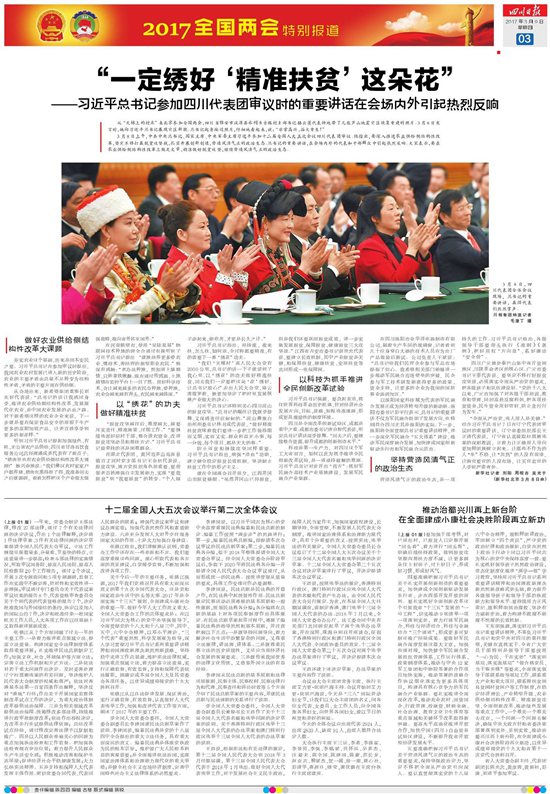 本版最醒目的是新华社消息《习近平参加四川代表团审议》,文前清晰列出了总书记在四川团重要讲话的4个要点:农业发展、脱贫攻坚、创新创造、政治生态。