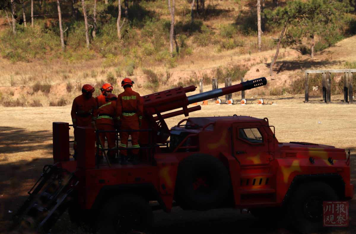在野外训练场,记者还看到一门“红衣大炮”,便好奇地上前观看。原来这是大队今年新配发的119毫米远程森林灭火炮,有效射程可以达到7公里,专门针对高山峻岭、无水源供给、人员难以接近的森林火灾设计制造。经过一段时间的专业理论学习后,大队第一次将其拉到野外开展实弹发射训练,让指战员熟悉操作流程,测试装备性能,检验应对复杂火场情况的能力。