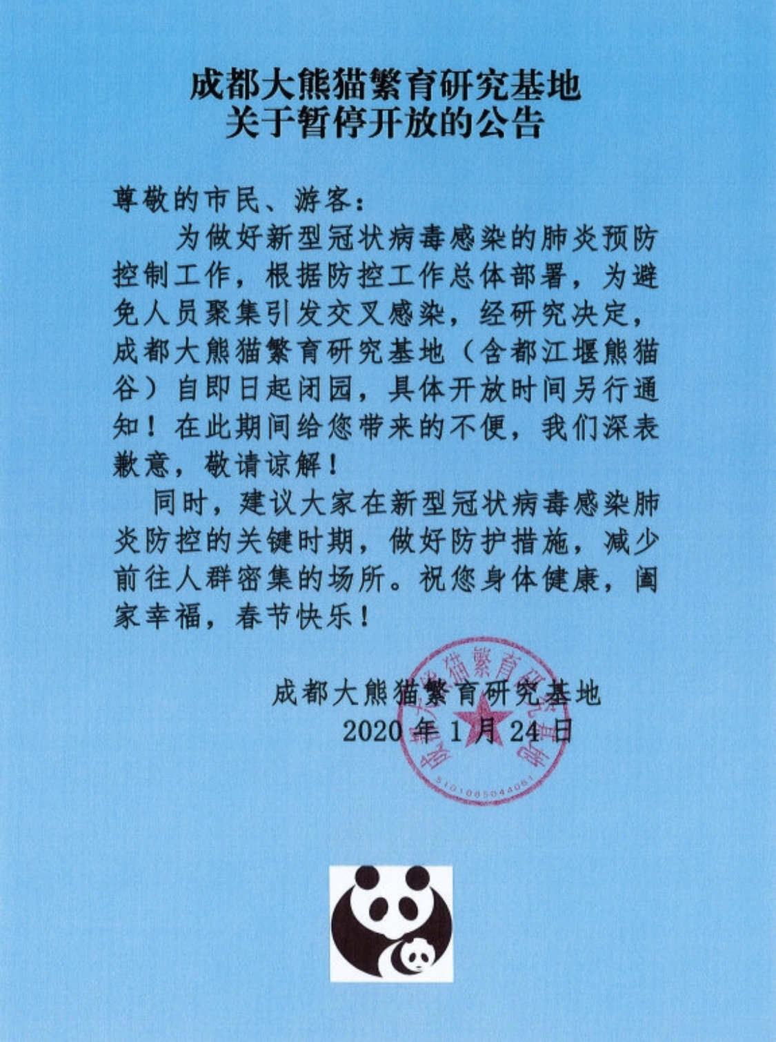 1月24日,成都大熊猫繁育研究基地发布公告,即日起闭园,具体开放时间另行通知。公告如下: