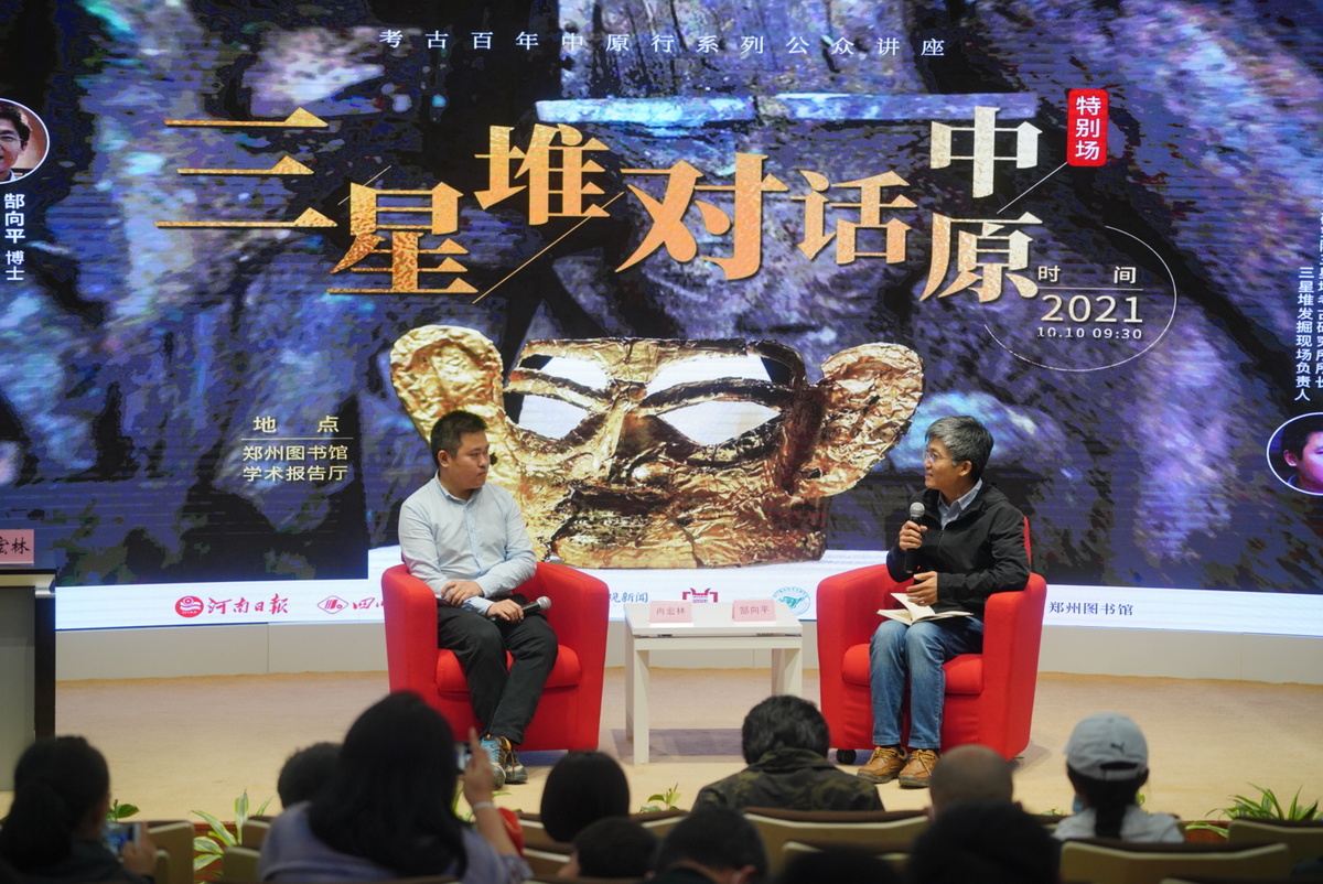 10月10日9:30,一场古蜀文明与中原文明的对话在郑州举行。四川日报·川观新闻联合河南日报、顶端新闻、 河南省文物考古研究院、四川省文物考古研究院、郑州图书馆共同举办了《再醒惊天下——三星堆遗址的最新发现与考古历程》讲座。四川省文物考古研究院三星堆考古研究所所长、三星堆发掘现场负责人冉宏林,讲述三星堆遗址的最新发现与考古历程,并与郑州大学历史学院副院长、副教授郜向平展开对谈,吸引现场不少当地考古爱好者们互动提问。冉宏林和郜向平都点赞了现场观众问的问题“不错”,冉宏林谦虚地开玩笑说:“大家对考古这么感兴趣,问的有些问题有些难,我甚至都有点担心自己回答不好。”
