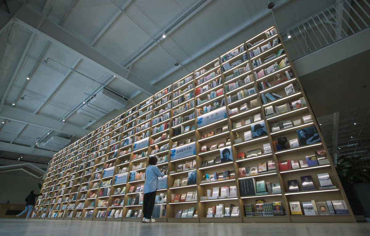 空间内,千本图书组成的书墙首先映入眼帘,图书种类涵盖人文、旅行、商业、心灵成长、技能提升等各个领域。此外,2700平米的开敞空间里,还有咖啡吧、自习区、健身区等,除了阅读、购买图书,还承载了直播、展览、交友、展览、自习、社工服务等多种功能。
