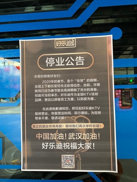 位于成都高新区的仁和新城商场7楼的一家KTV也已空无一人,门口张贴了通知:为响应全国抗击疫情行动,该店于2020年1月24日起暂停营业,开放时间另行通知。