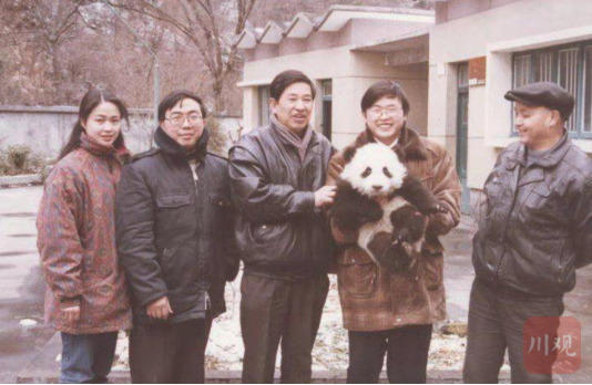 赖炳辉和中国大熊猫保护研究中心首只人工繁育大熊猫“蓝天”合影