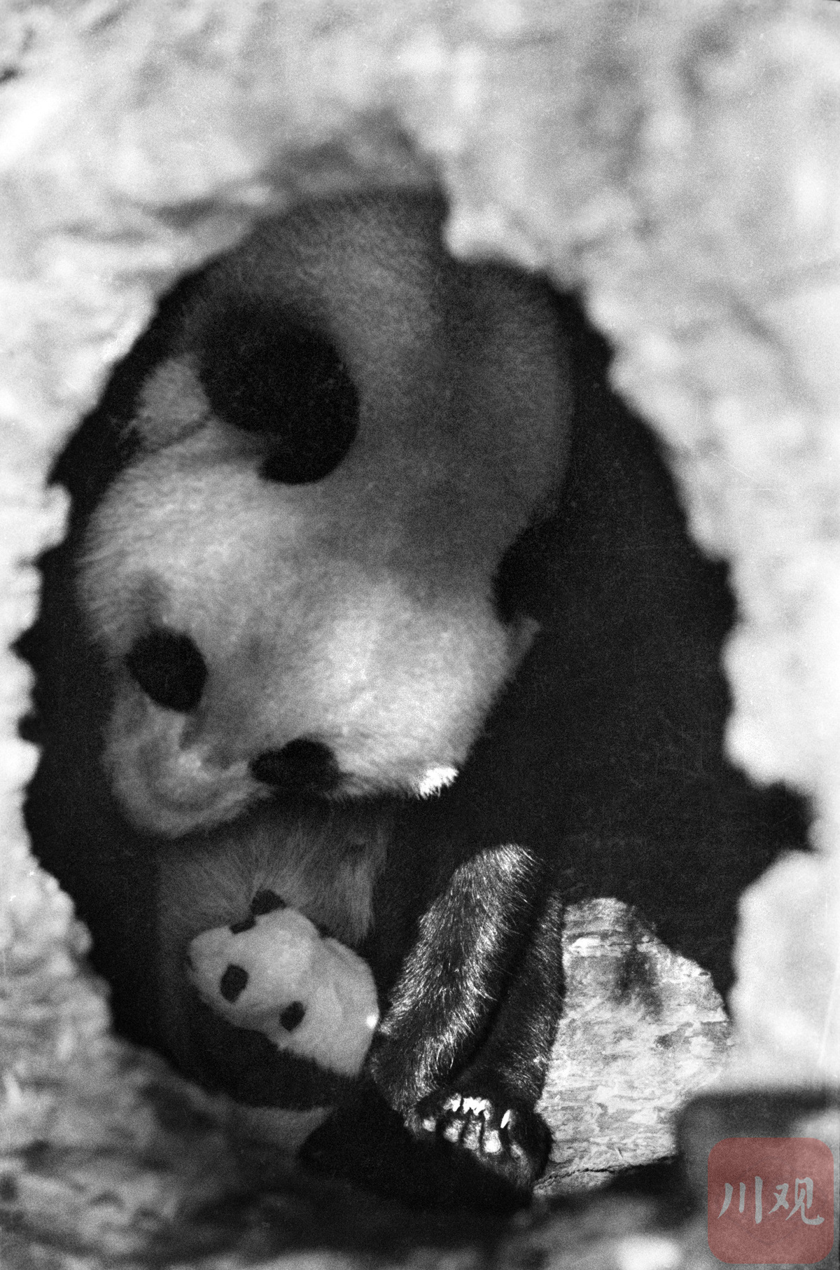 1982年9月30日,在硗碛乡,大熊猫产下一只幼崽,幼崽在母亲怀里发出咩咩叫声,拍下大熊猫野外产子的罕见画面。高华康 摄