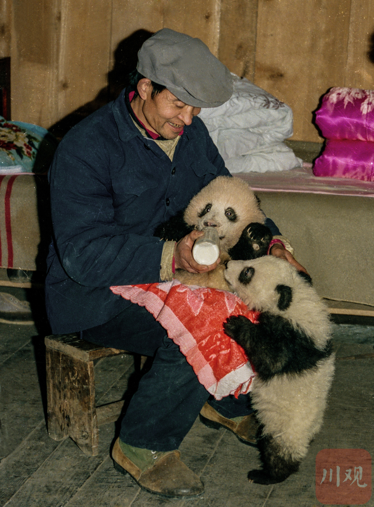 1988年秋季,宝兴蜂桶寨自然保护区员工李武科在家里喂养两只野生大熊猫幼崽的场景。正在吃奶的一只幼崽就是以后大名鼎鼎的亚运会吉祥物“盼盼”的原型。高华康 摄