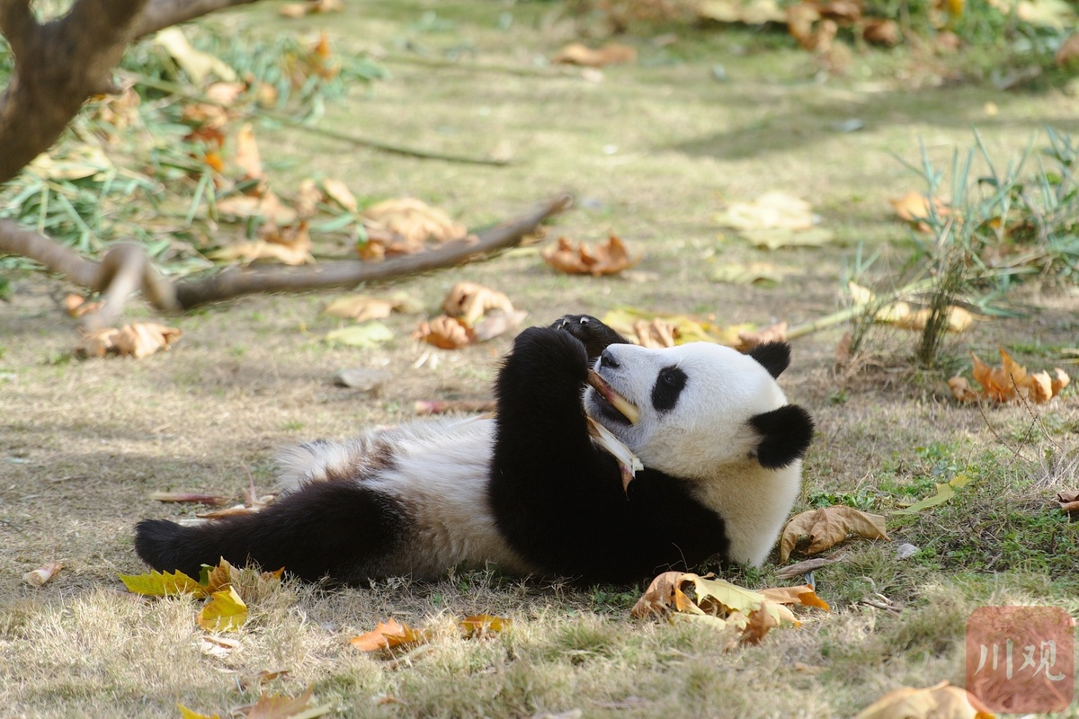 一只“吃货”滚滚,躺在地上进食。 川观新闻记者 杨树 摄