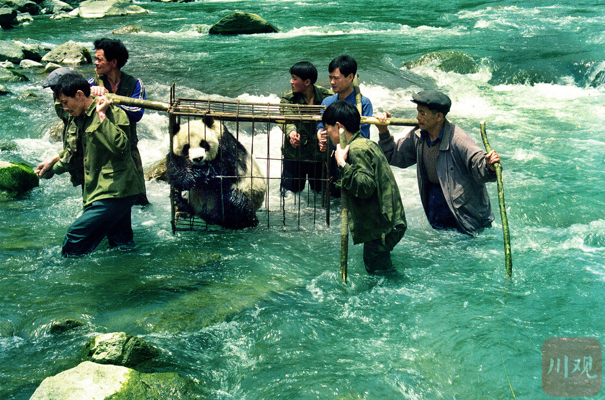 1984年7月23日,在宝兴县蜂桶寨乡发现一只患病大熊猫。拥有丰富经验的保护区工作人员王帮军带领五六名当地村民,趟过齐腰深、水流湍急的宝兴河,将大熊猫营救回保护区。高华康 摄