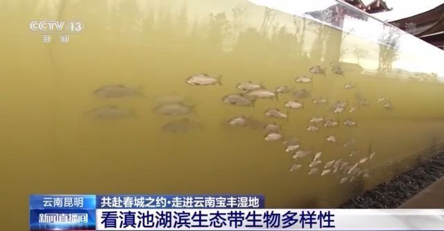 再说动物,湿地的建成,就为动物们提供了草灌丛和林带等适宜它们的环境,苍鹭、家燕、骨顶鸡等10多种鸟类也在这里安家落户。除此之外,滇池金线鲃、昆明裂腹鱼等多种曾经一度消失的鱼类,现在也在滇池重新出现。在宝丰湿地,就专门设立了一个鱼类展示区,像这个肚子上有一条小黑点的鱼,就是滇池金线鲃。