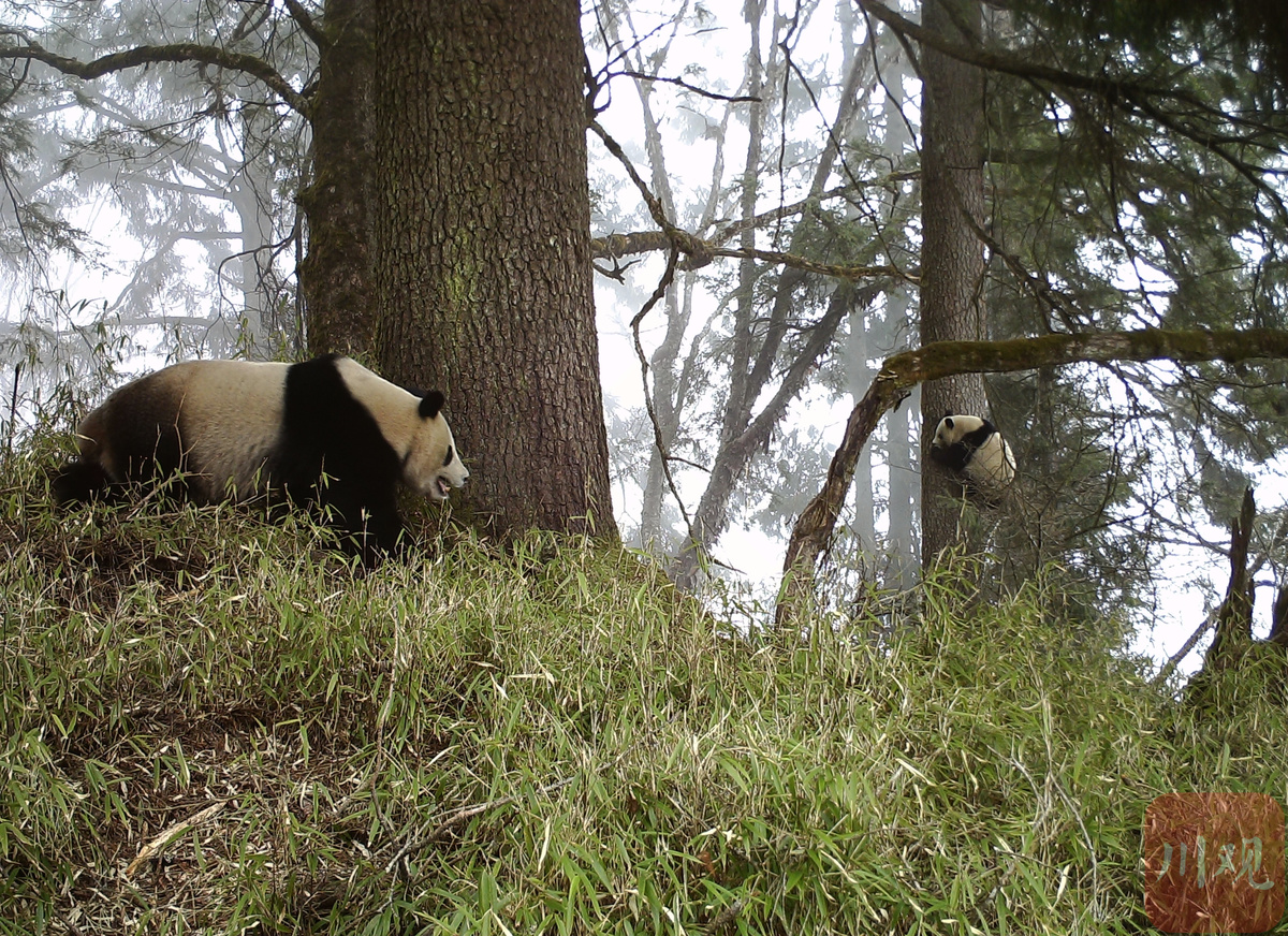 大熊猫国家公园卧龙片区红外相机照:野生大熊猫宝宝顽皮爬树,熊猫妈妈在树下凝望守护