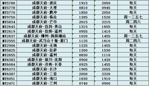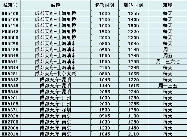 昨天(10月11日)下午,东航四川分公司公布了新航季成都出港航班计划,其显示东航在成都运营的大部分航班转场至天府机场出港。