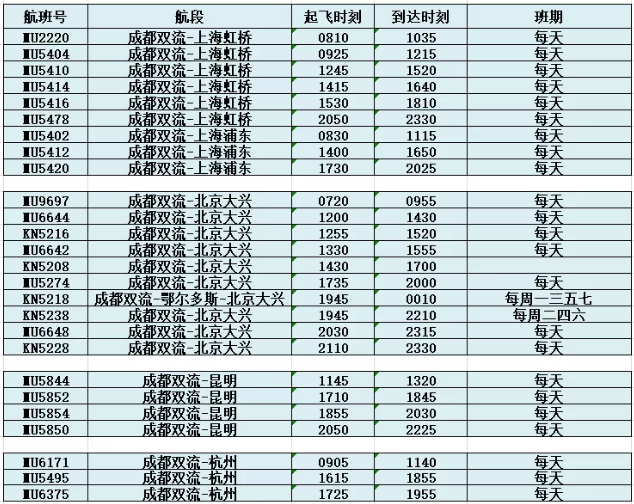 执行新航季航班计划后,东航保留在成都双流机场始发国内航线只通达6个航点,分别为上海虹桥、上海浦东、北京大兴、昆明、杭州、鄂尔多斯(经停至北京大兴),其余的国内航线航班全部转场至天府机场始发。