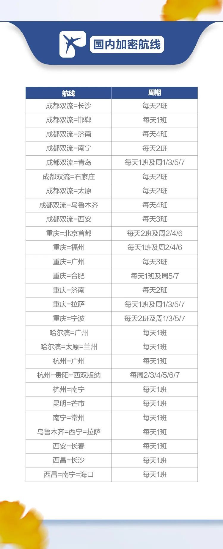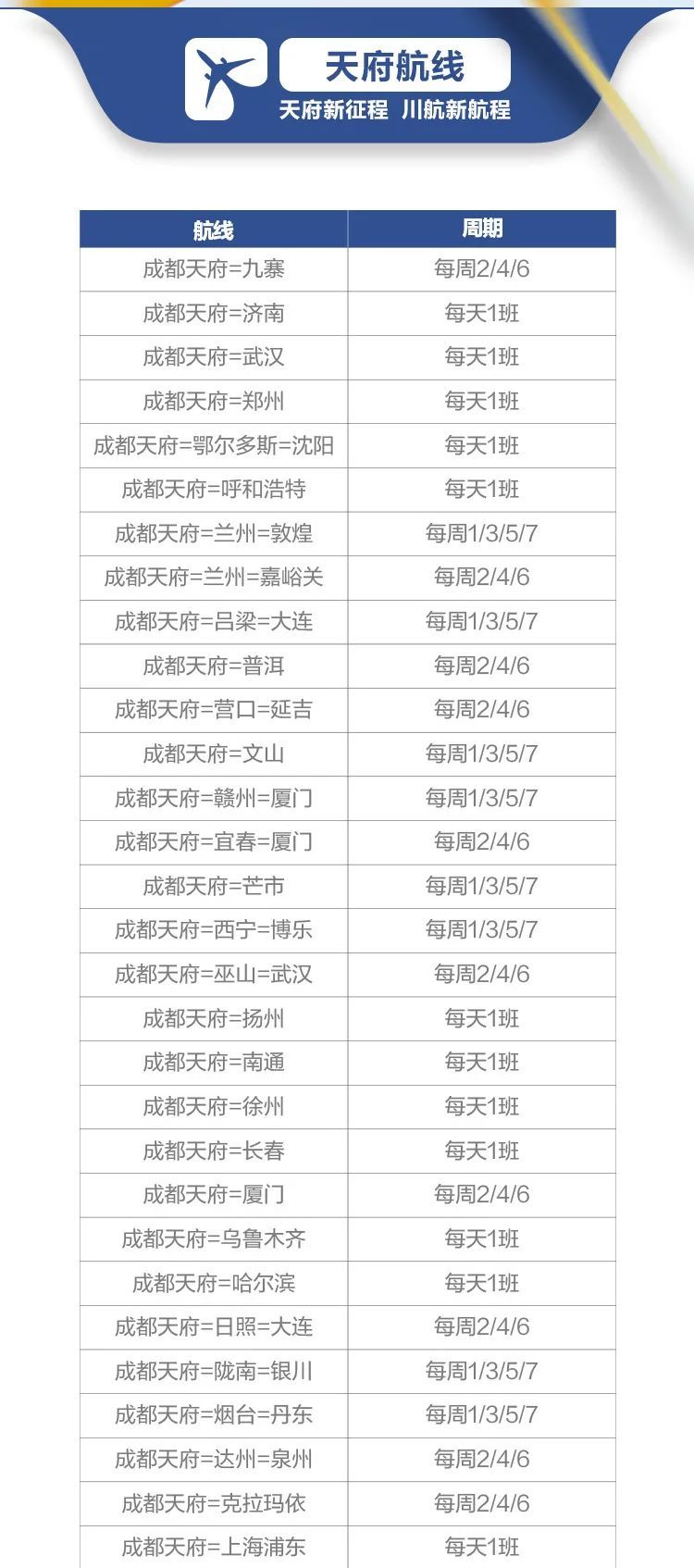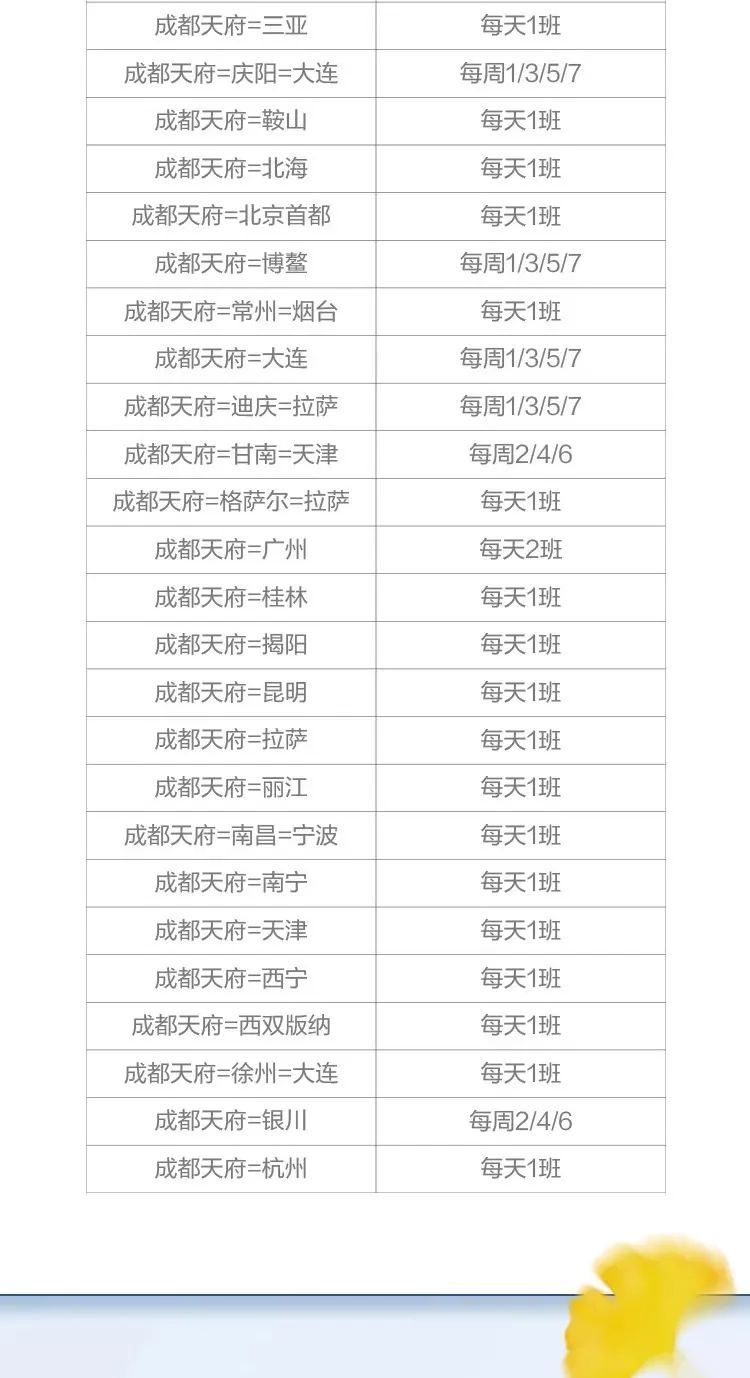 针对新航季的特点和需求,川航在天府国际机场执飞的国内航线将超过50条(具体航线详见下表),同时川航还将加大成都至长沙、邯郸、济南、青岛、南宁、石家庄、太原、西安、乌鲁木齐等国内航线的航班密度,最多的每天航班密度将达4班。另外,还将新开通成都双流-兰州-喀什航线,每天一班。