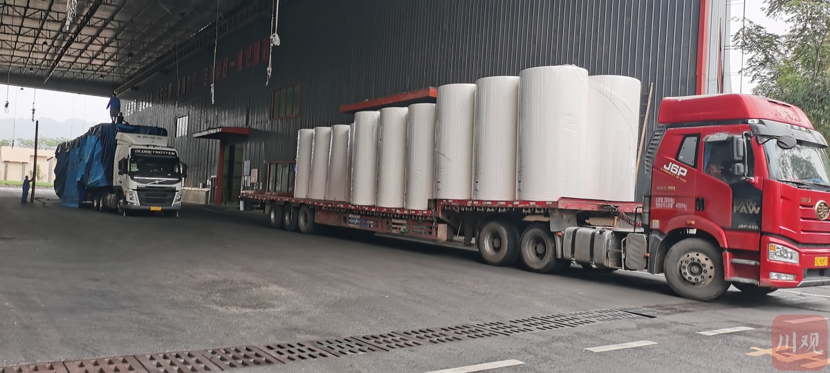 四川凤生纸业公司仓库外,正在运输装载原纸产品