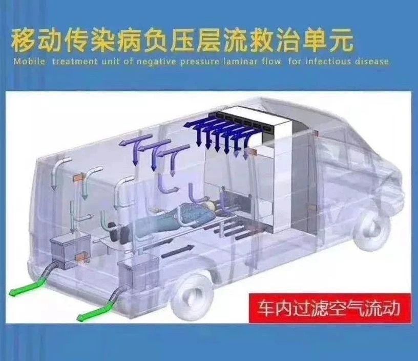 据悉,负压舱内负压空气净化空调采用流体力学的设计原则,通过高效空气过滤器的平衡气流压力,使负压舱内形成一个固定的空气流场区域,空气由清洁区(医务人员区)流向感染源区(病人区),负压舱内的空气压力在-10Pa~-120Pa之间,使得空气流的死角和漩涡流最小。