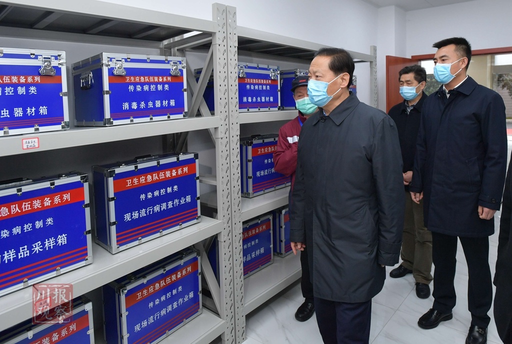 1月27日,省委书记彭清华到绵阳市疾病预防控制中心检查督导疫情防控工作,在医疗应急物资库房了解医用防护口罩、消毒药品、后勤保障设备等物资储备及调配情况。