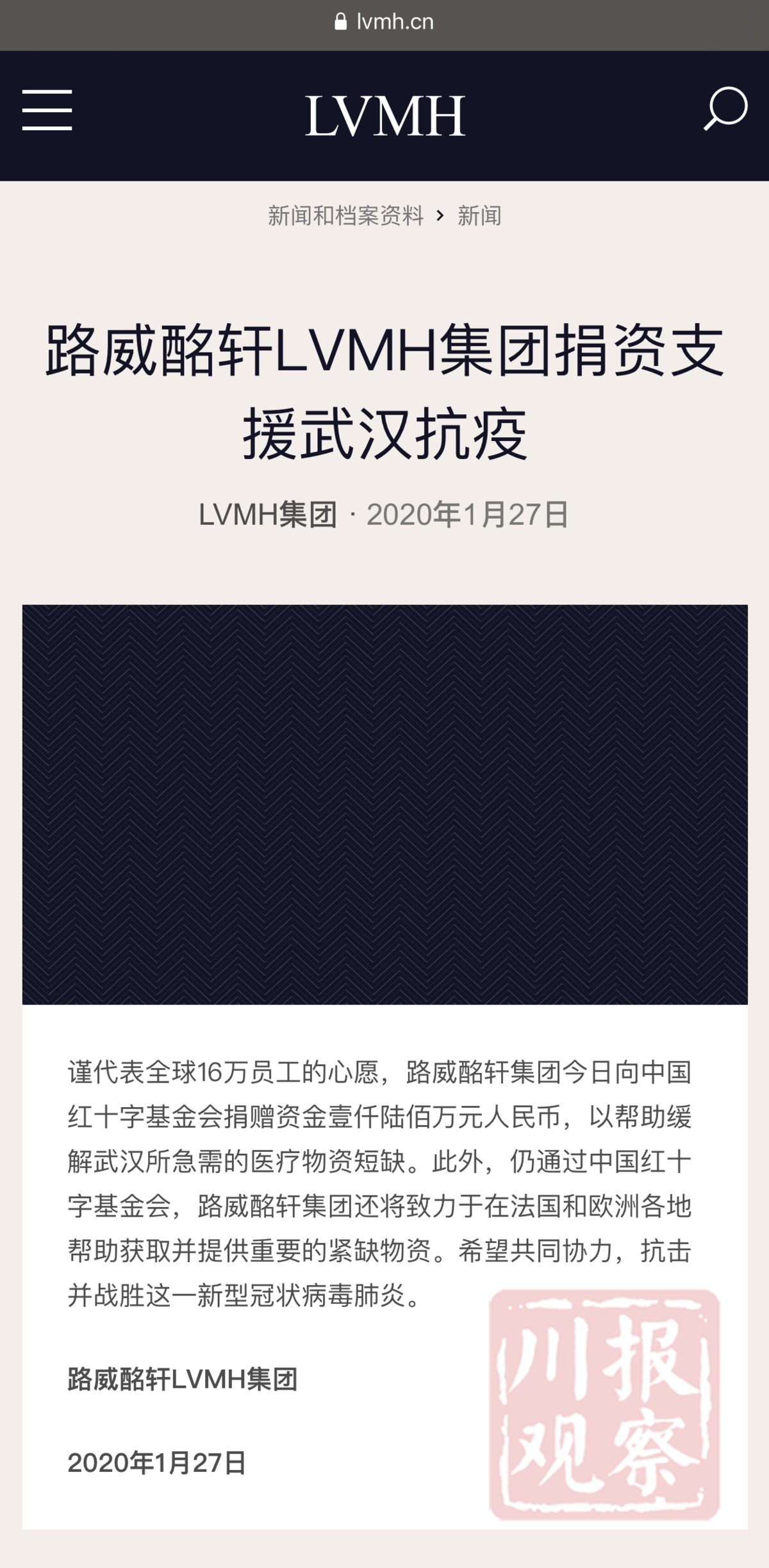 共力抗击新型冠状病毒感染肺炎疫情。1月27日,法国奢侈品巨头路威酩轩集团(LVMH)在其官网发布消息称,向中国红十字基金会捐赠资金1600万元,以帮助缓解武汉所急需的医疗物资短缺。