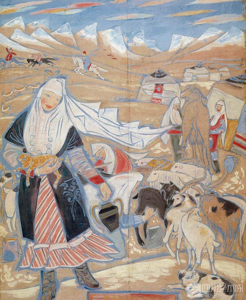 吴作人在40年代初,先后两次到川西高原和甘肃、青海藏区写生,也同著名的英国科学家李约瑟(《中国科学技术史》作者)一同去了敦煌。西北之行结束后,吴作人根据大量写生画稿加工整理出一百多幅油画、水彩、速写作品,先后在成都、重庆举办两次个人画展,受到艺术界的高度评价。徐悲鸿对吴作人坚守写实作风并走向西北地区以求新拓展的精神大加赞赏,他认为吴作人“三十二年春,乃走西北,朝敦煌,赴青海,及康藏腹地。摹写中国高原居民生活,作品既富,而作风亦变,光彩焕发,益游行自在,所谓中国文艺复兴者,将于是乎征之夫。”[iv]从此,吴作人与西方学院主义分道扬镳,而执着于明朗简略,追求韵律的民族现实主义画风的建构之中。凡走进敦煌、走进莫高窟的艺术家无不被精湛而瑰丽的传统壁画所折服,也为西北壮美的景色和各族人民的多姿多彩的生活所感动。丰厚的传统诱发了他们创作的灵感,使他们的创作都具有了新的面貌。尽管他们的画风仍保持着鲜明的个性特色,但是,他们都在实践上为创立具有民族特色的现代主义艺术作着有益的尝试。董希文的油画《开国大典》通常被认为是中国油画民族化的开山之作,其实在抗战中,他在深入西南与西北民族地区的过程中,特别是通过对敦煌壁画的临摹,就开始自觉探索油画民族化的道路了,40年代中期他创造他创作的《哈萨克牧羊女》更多地吸取了敦煌壁画的表现形式与技法,其图式、色彩、线条和物像造型显示出浓郁的东方艺术情调。可以说这是具有民族特色的中国现代油画的经典之作。