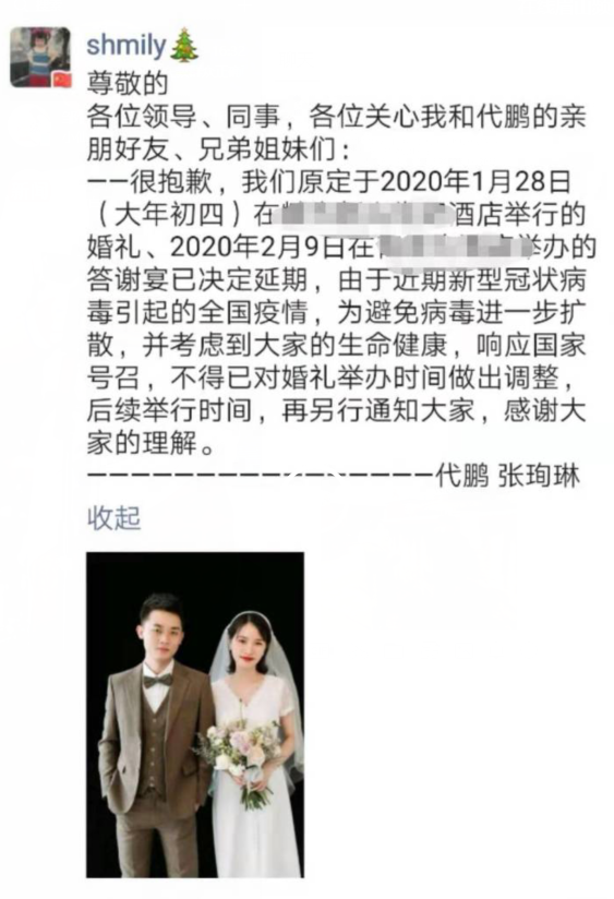 1月25日上午11点,张珣琳在朋友圈发了一条特殊的动态——宣布原定于1月28日的婚礼延期。