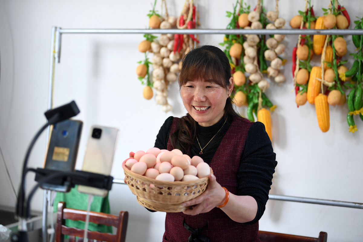 在安徽省六安市舒城县南港镇公义村钱元玲的家庭农场,钱元玲在直播间售卖土鸡蛋(2021年3月4日摄)。新华社记者黄博涵摄