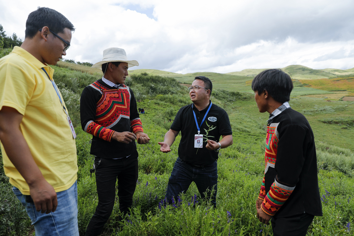 在位于四川省凉山彝族自治州昭觉县龙沟乡境内黄芩种植基地,西南医科大学副教授夏纪毅(右二)和该校派出的驻村工作队员俄且莫机(左一)为当地彝族群众讲授黄芩种植和采摘技术(2020年8月14日摄)。新华社记者沈伯韩摄