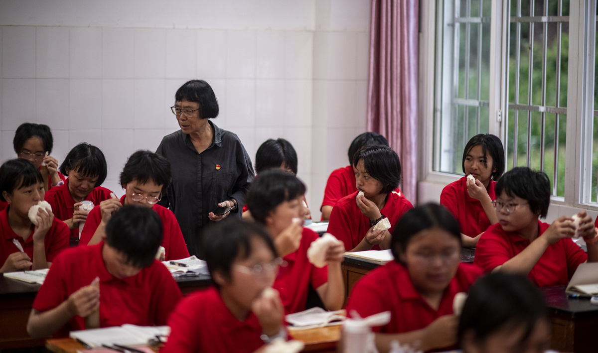 云南丽江华坪女子高级中学校长张桂梅在晨读之后来到教室督促大家好好吃饭(2021年8月24日摄)。新华社记者江文耀摄