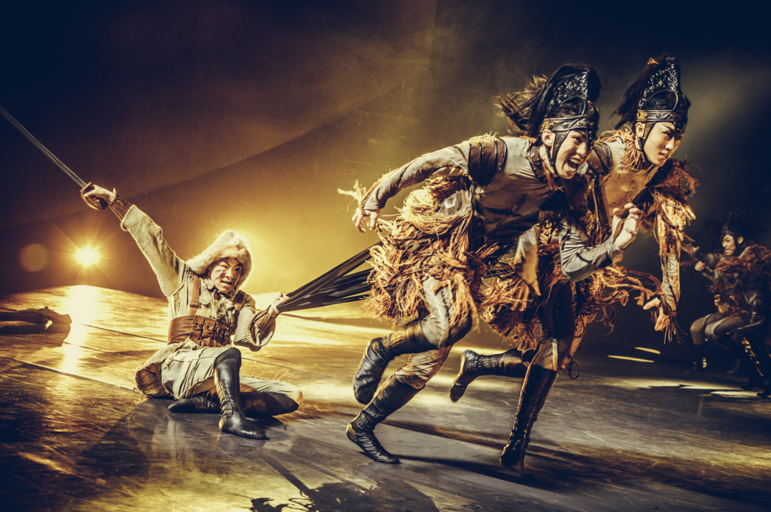 动作语汇的民族表达。舞剧有着自己独特的表现方式和手段,能运用独特的物质媒介去进行艺术创作。《骑兵》作为讲述蒙古草原故事的舞蹈作品,自然带着蒙古族舞蹈的风格特点,但编导并未拘泥于舞蹈的程式化动作,而是进行了新变的再创造。其中的叙事性语汇并不是将生活内容简单的舞蹈化,编导尤其注意到了在生活内容舞蹈化的同时,保留蒙古族舞蹈的风格印象与韵味,并在恰当的时间点安置亮眼的巧思,使整部舞剧从头至尾紧紧抓住观众的视觉焦点,同时也不断带来意外之喜。例如开场时策马奔腾的骑兵形象就是在提取草原日常生活策马奔腾的状态加以舞蹈化,增加蒙古族舞蹈常用的肘部动作并在空间上进行了夸张化的处理,从而呈现骑兵们的豪气与英勇。