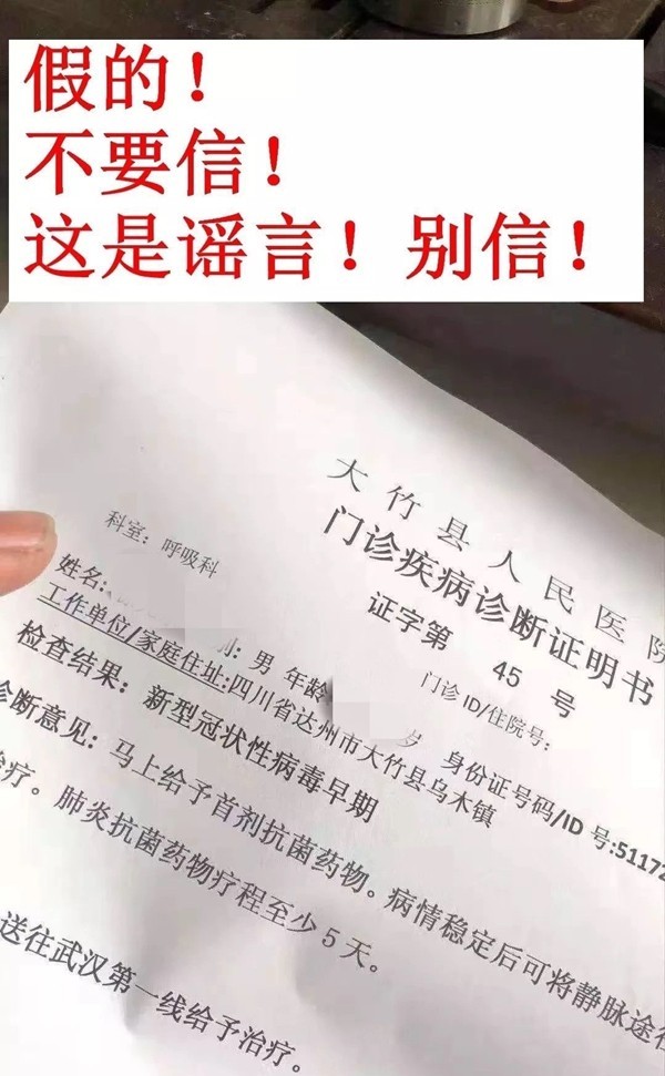 1月28日,一张印有“大竹县人民医院门诊疾病诊断证明书”的文件图片在网络传播,“诊断书”显示家住大竹县乌木镇的徐某检查结果为“新型冠状病毒早期”,并需要“送往武汉第一线给予治疗”。记者从大竹县人民医院了解到,该诊断证明书系伪造。