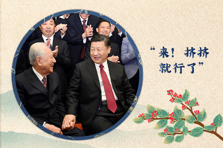 总书记拉着他们的手,请两位老人坐到自己身边来,两人执意推辞,总书记一再邀请:“来!挤挤就行了,就这样。”自然而然的举动,正是总书记尊老敬贤的真情流露。