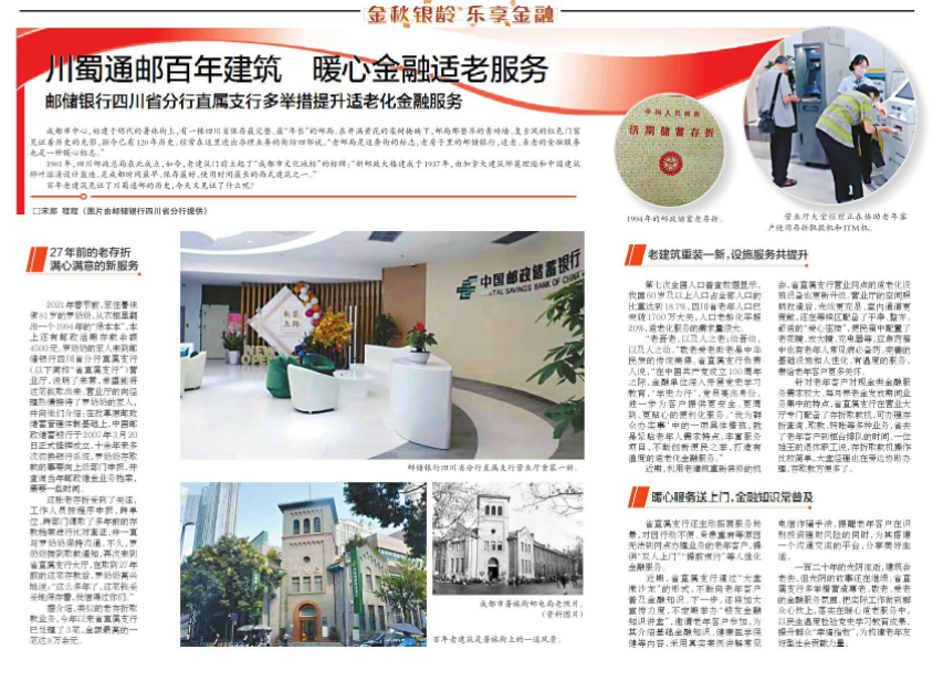 成都市中心,始建于明代的暑袜街上,有一栋四川省保存最完整、最“年长”的邮局。在开满黄花的栾树掩映下,邮局那整齐的青砖墙、复古风的红色门窗见证着历史的光影,距今已有120年历史。经常在这里进出办理业务的街坊四邻说,“老邮局是这条街的标志,老房子里的邮储银行,适老、亲老的金融服务也是一种暖心标志。”